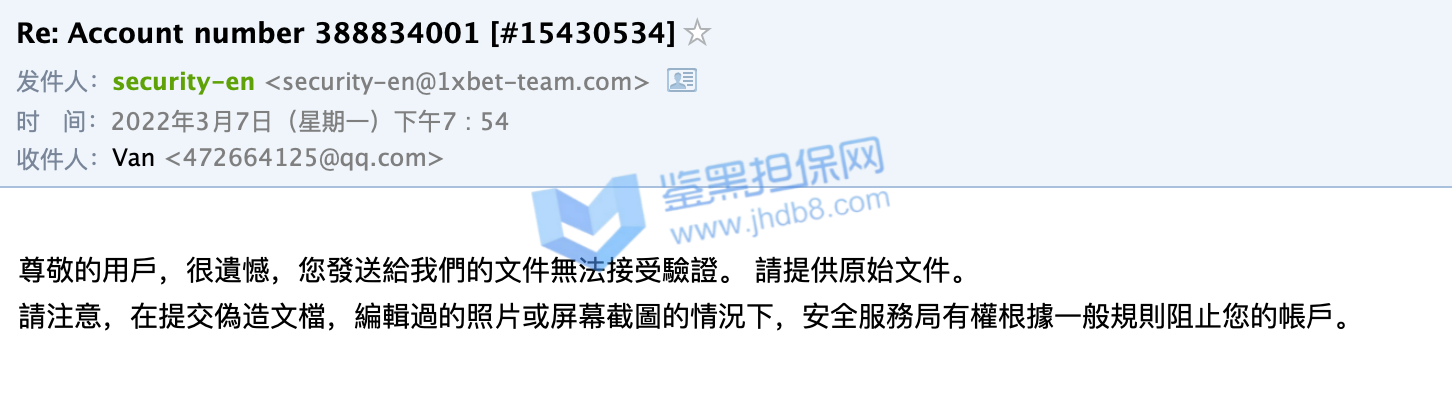 2022年3月1日我在1xbet充值了1万8的金额,想买各种比赛,到昨天3月7日,因为运气好,这个1万8的金额已经变成了6万元,我想取款,结果得到的消息是必须连续安全部分审核,我好奇为何注册的时候,存款的时候没有让我注册,但是也没多犹豫。随后就开始了一系列莫名其妙且扯皮的的过程。首先是一个说英文的客服回复我,让我提供银行流水证明,还必须是原件,带公章的,中国银行刚好可以开具这部分信息,我就提供了,然后让我提供身份证正反面,我也提供了,最奇葩的来了,让我把身份证放脸旁边拍一个自拍,带上他发我的那个邮件,这个有点过分了,但是我还是照着要求做了,随后他和我说资料审核结束,随后会有人联系我。我等了好久还是没有人联系我,我就主动发邮件询问,结果这次是个中文客服回复我,让我在不同的角度再拍一次身份证照片,我照做了,然后以文件大小不足1m为由让我重拍,我重拍之后,又换了个英文客服,说我提供的不是源文件,无法受理。我之后用不同角度/不同光线/甚至是扫描件发送我的身份证照片,都和我说不是他们要的文件,我随后发了我的护照照片,也是扫描件,一开始回复我要jpg照片文件,我发了以后,又回复我说不是他们要的文件了。这一系列过程下来让我觉得他们就是在刁难我,甚至是在骗取我的个人信息。希望鉴黑网可以帮我一下,帮我追款,谢谢。我的1xbet账号是388834001